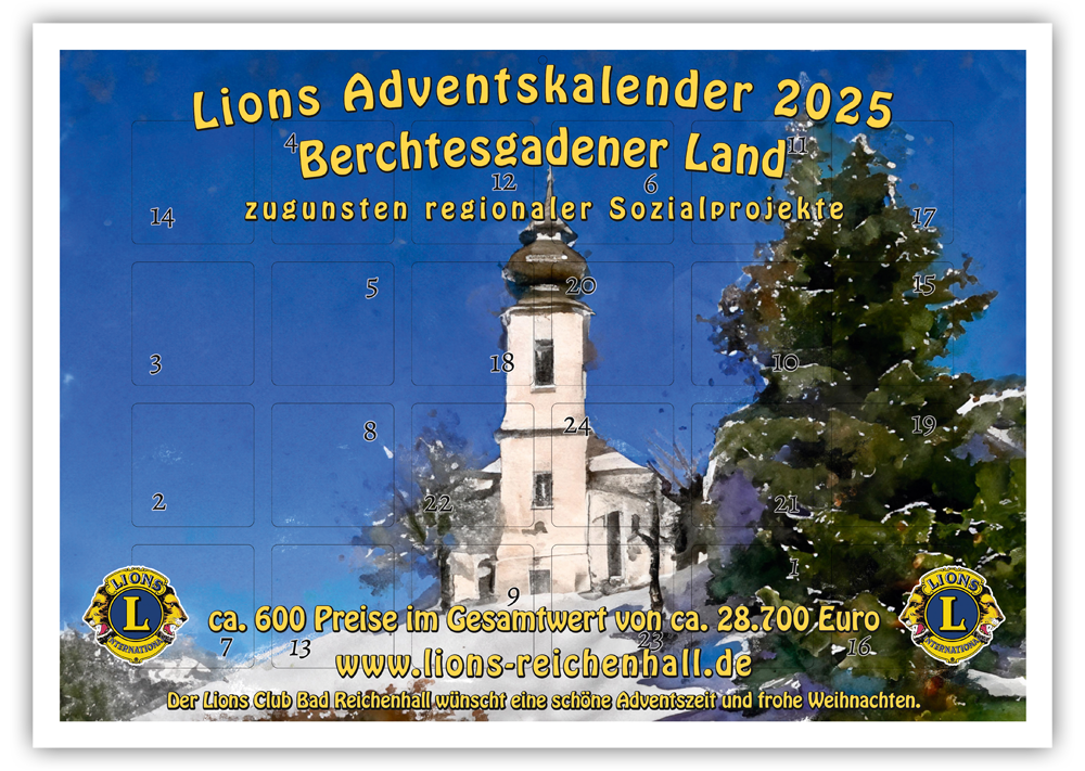 Bereits seit dem Jahre 2010 wird jährlich die Aktion „Lions-Adventskalender Berchtesgadener Land“ durchgeführt. Die Adventskalender können seit dieser Zeit unverändert für fünf Euro je Stück, solange der Vorrat reicht, bezogen werden. Der Lions-Club Bad Reichenhall unterstützt mit dem Reinerlös aus dem Verkauf des Lions-Adventskalenders insbesondere regionale Sozialprojekte. Sämtliche Mitglieder des Lions-Clubs Bad Reichenhall und des veranstaltenden Lions-Hilfswerks Bad Reichenhall e.V. arbeiten ehrenamtlich und unentgeltlich. Das weihnachtliche Kalenderbildmotiv der Kirche von Maria Gern wurde mit KI-Unterstützung kreiert und kann auch als gerahmtes Bild im Kalender gewonnen werden. Der Hauptpreis im Kalender ist ein handsigniertes Exemplar einer Andreas-Magnum-Graphik des Künstlers Andreas Hentrich im Wert von 3.000 Euro. Der 2.-te Preis sind € 1.000,- in bar.