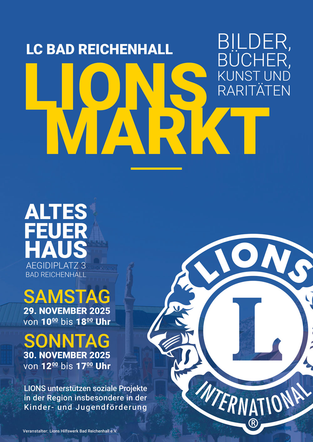 findet wieder der traditionelle Verkaufsmarkt des Lions Club Bad Reichenhall in der Galerie des Alten Feuerhauses in Bad Reichenhall statt. Der Reinerlös dieses Marktes kommt zahlreichen vom Lions Club unterstützten sozialen Projekten in unserer Region zugute.